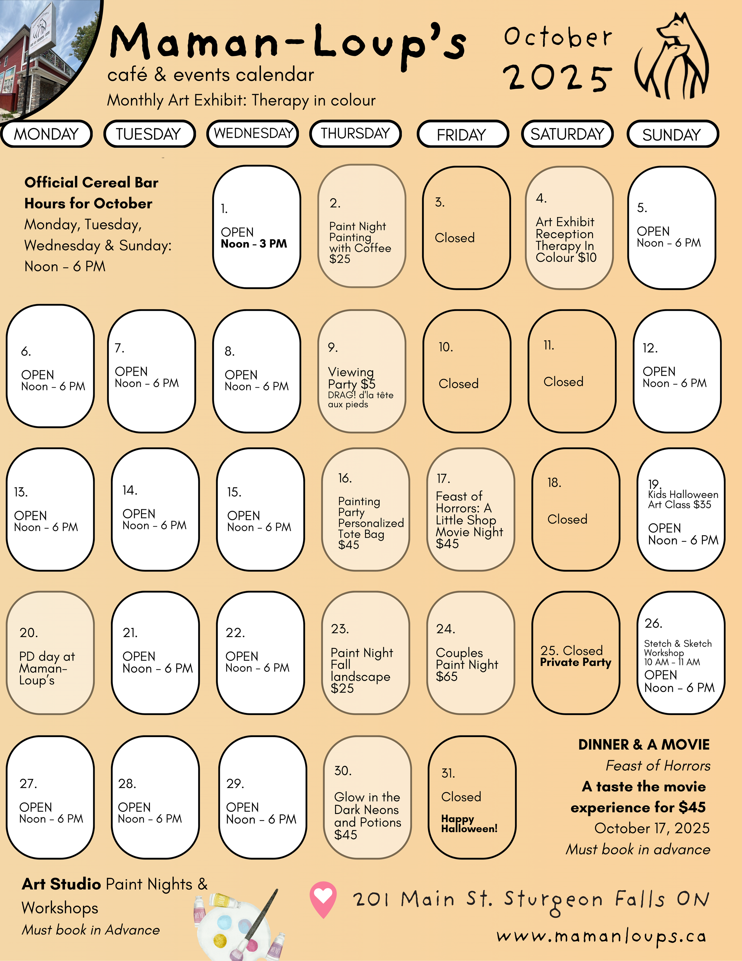 Inspired by the warmth and creativity of our beloved grandmothers, Maman-Loup's Art & Céreal Bar is a haven where art meets breakfast-snack magic. Nestled in the heart of Sturgeon Falls, Ontario, we invite you to experience a space that embodies the spirit of community and imagination.