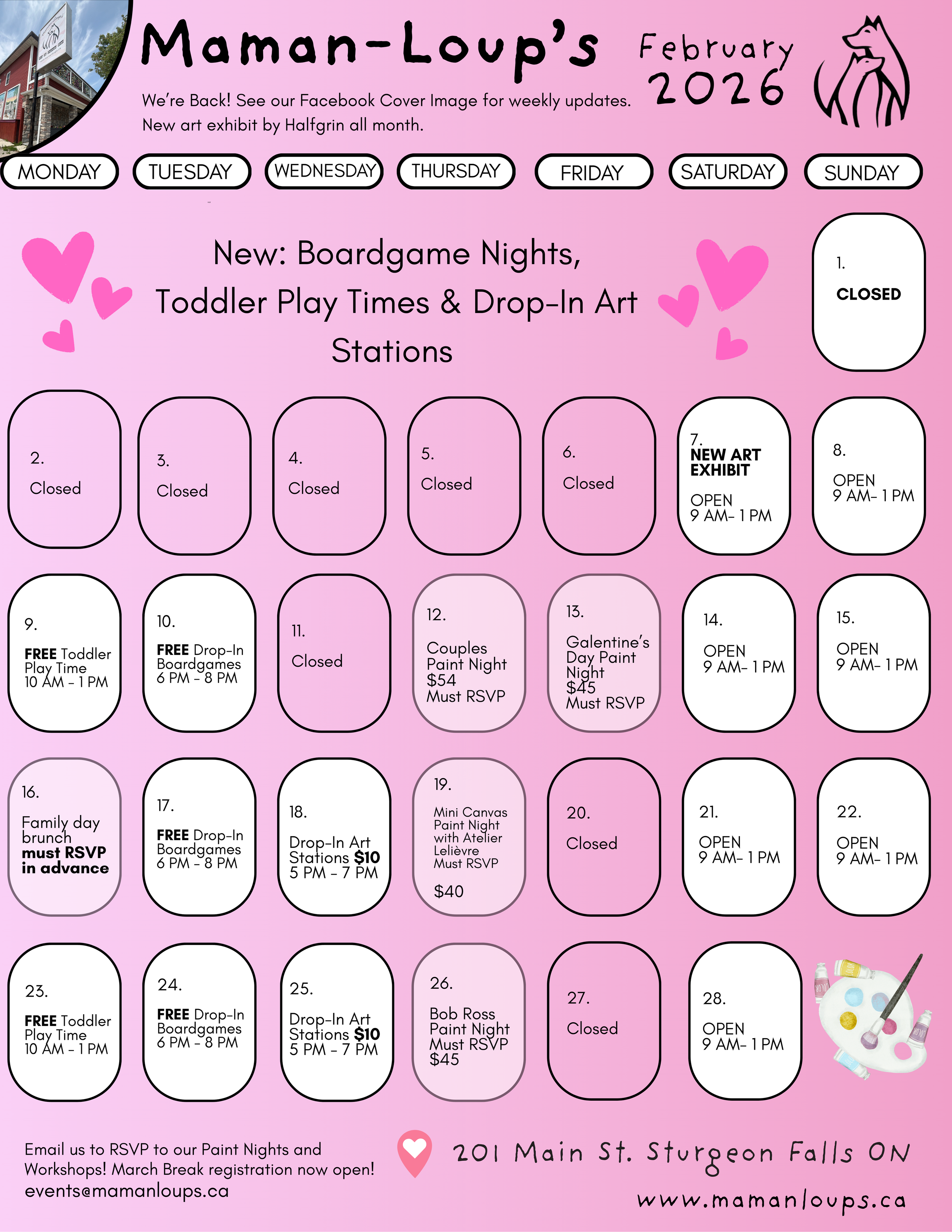 Be sure to follow us on Facebook and Instagram @mamanloups.ca for updates on our special Friday and Saturday drop-in events!